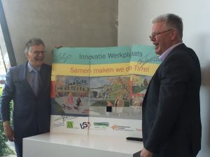 Marc Verschuren (Wethouder gemeente Winsum) en Han de Ruiter (Directeur Centre of Expertise Healthy Ageing) bij het bord waar alle betrokken partijen zojuist een handtekening op hebben geplaatst. Het bord bestond uit puzzelstukken. De betrokken partijen hebben samen “de puzzel” gelegd. Dit stond symbool voor de puzzel die de Tirrel en de Hanzehogeschool met elkaar aangaan, en daarnaast voor ontmoeting en verbinding: Samen maken we de Tirrel.